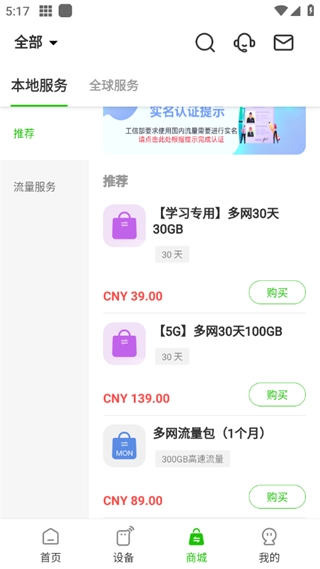 随时在线,畅行无阻!我们新上线了“套餐”页面,让购买流量包的操作更便捷。同时,还新增了适配5G设备的移动流量选项,助您出行无忧。