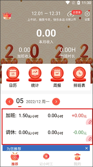 5、【加班日历】:一张日历清楚显示每天加了多久班,拿到多少钱。一天一天的努力,加起来就是你一月的收获。