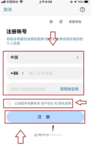 2、输入手机号、验证码和密码,并勾选“用户协议”,接着点击注册按钮。