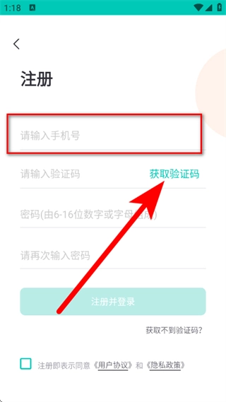 3、在注册登录页面,输入手机号后,点击获取验证码。