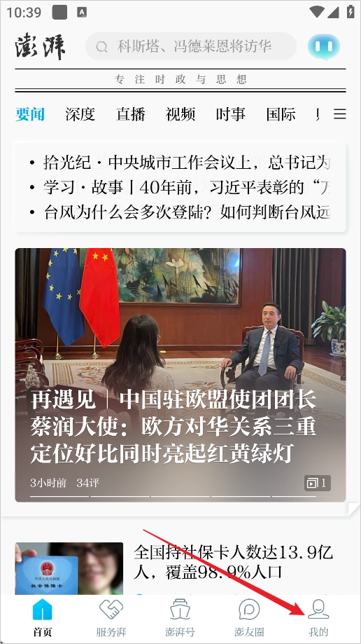 1、打开澎湃新闻App,点击右下角的“我的”选项