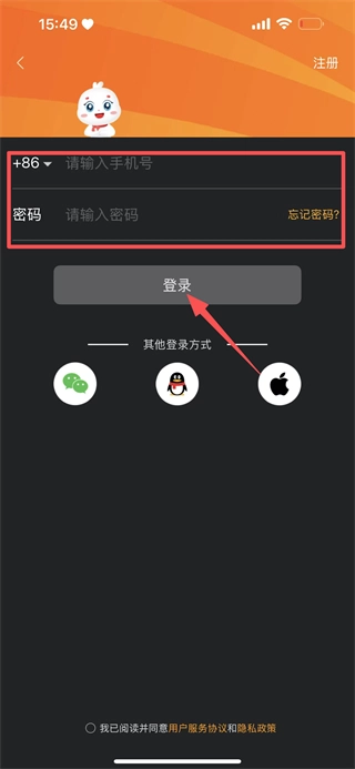 4、在账号密码登录界面,输入手机号和密码,点击登录,完成登录操作。