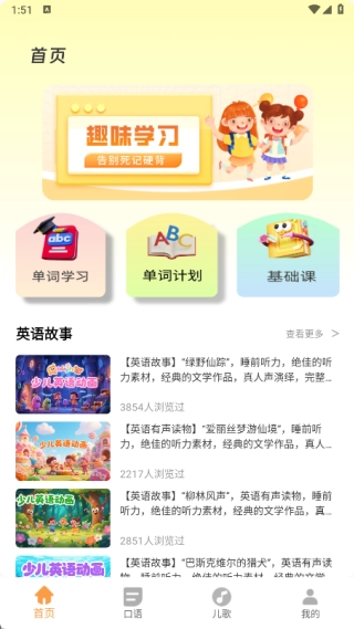 1、首页设有单词学习、单词计划、基础课板块,你还能在这里了解到各类精彩的英语故事;