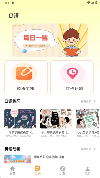 3、在口语页面中提供英语字贴和打卡计划,同时了解口语练习和英语动画;