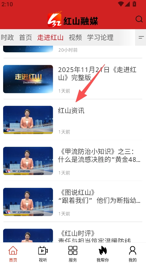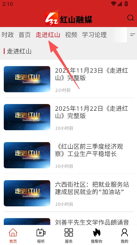 1、启动软件后,找到并点击“走进红山”板块,随后浏览红山本地的资讯列表。