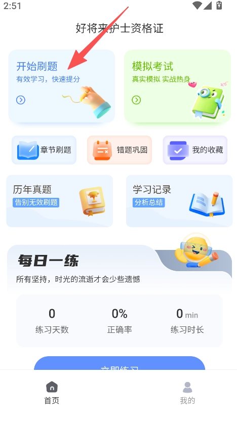 1、启动软件后,可选择“开始刷题”或“每日一练”进入答题界面,接着挑选对应答案,从而完成练习流程。