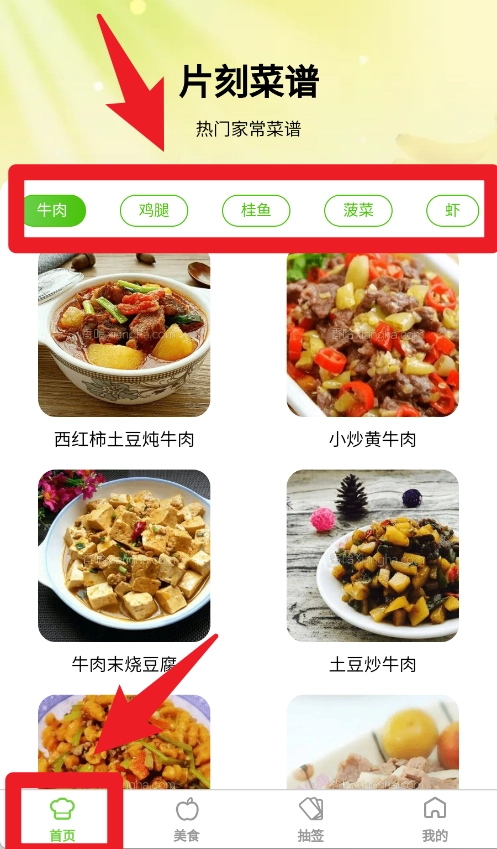 2、在首页可以通过顶部的食材分类快速筛选菜谱,点击不同标签即可查看对应的美食推荐。
