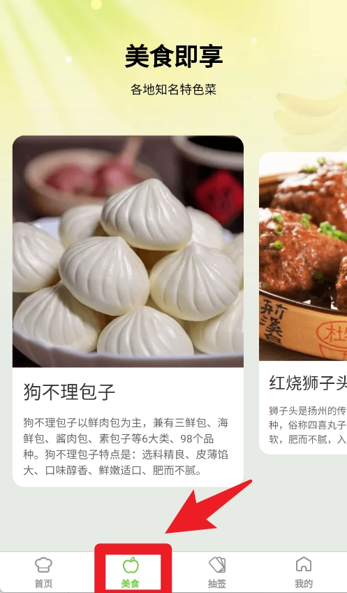 4、切换至美食板块,可以浏览各地特色美味,图文并茂的展示让人轻松找到想尝试的菜品。