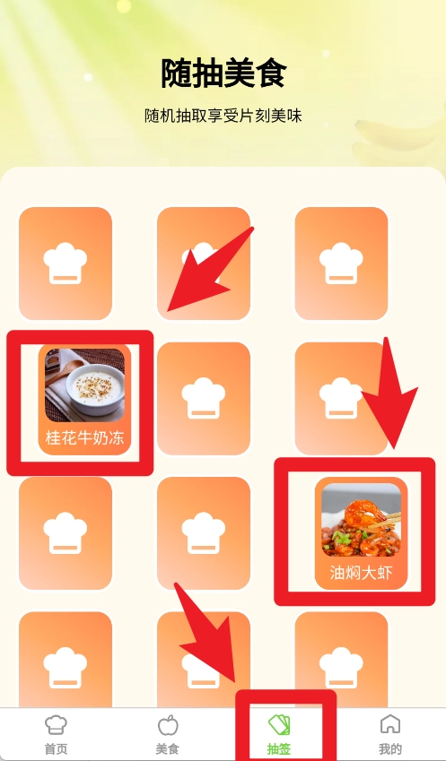 5、抽签功能提供随机推荐,用户点击后即可获取不同的美食建议,让日常饮食充满新鲜感与惊喜。