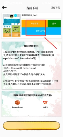 4、点击“开始”,完成后再点击“打开”按钮,即可使用心仪的PPT模板,开启你的创作之旅。