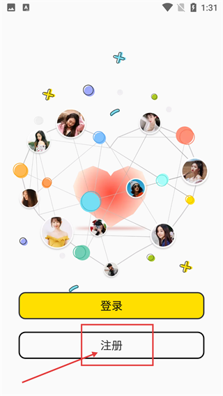 1、在初始页面里,用户能够选择【登录】或者【注册】操作,点击【注册】按钮就能进入注册流程,此页面采用社交关系链作为设计元素。