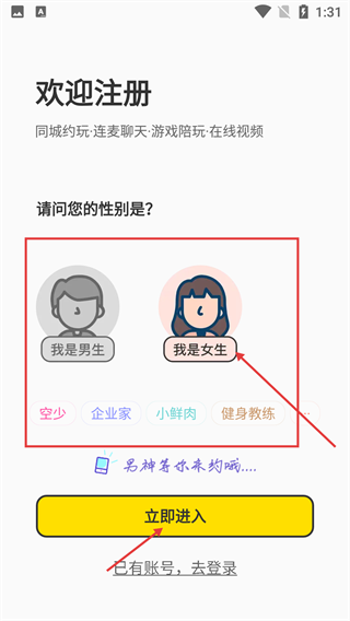 2、进入【欢迎注册】页面,需选择性别(如点击【我是女生】),并可选择对应的标签,完成后点击【立即进入】继续注册。