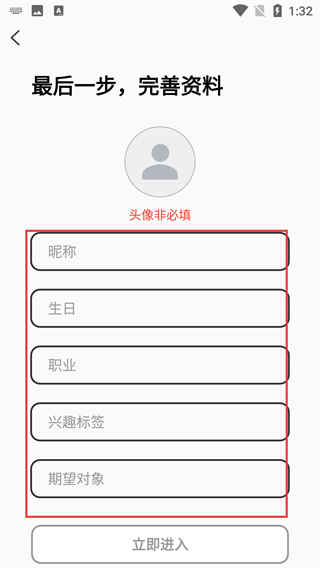 4、进入【完善资料】页面,需填写【昵称】【生日】等信息(头像非必填),填写完成后点击【立即进入】即可完成注册。