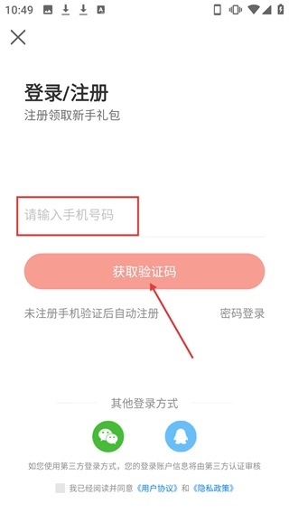 3、在登录/注册页面,输入手机号码后点击【获取验证码】。