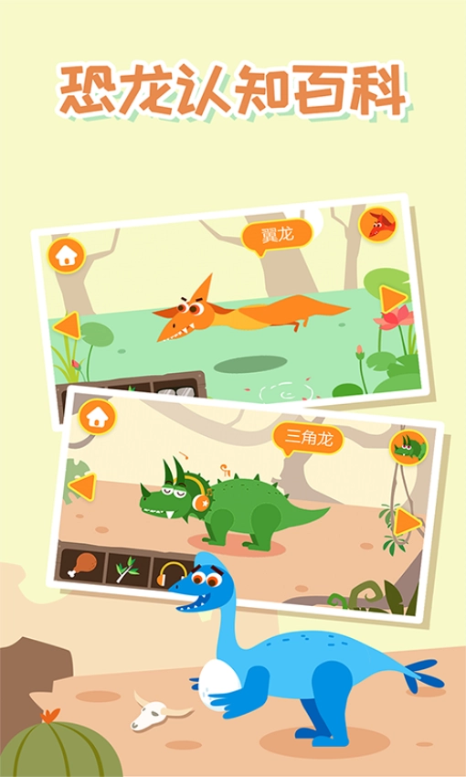 3、新增恐龙场景,带领小朋友认识更多恐龙生物,进一步加深对恐龙的认知。