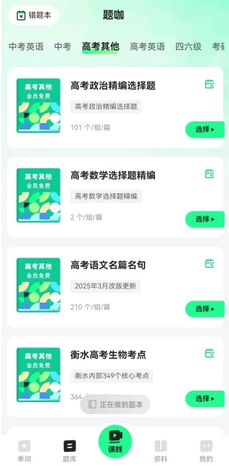 3、进入对应板块后,可挑选不同题库资源,自主安排学习进度。