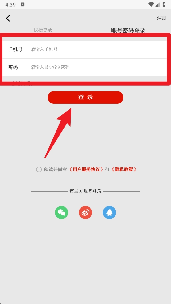 1、打开应用后,在登录界面输入已绑定的手机号码以及不少于6位的密码,勾选同意相关协议后,点击登录按钮即可进入系统。