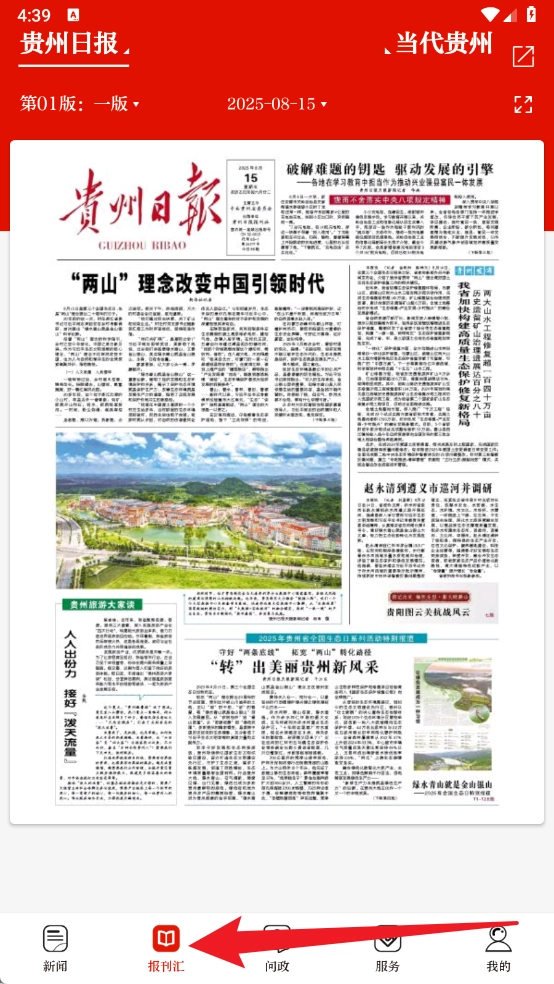 3、点击底部导航栏的报刊汇即可在线阅读《贵州日报》等数字报刊,支持翻页、放大及切换版面阅读。