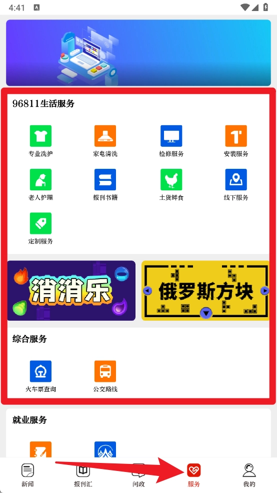 4、在底部导航栏选择服务可进入生活服务专区,涵盖家政、订票等多种便民功能,满足日常生活需求。
