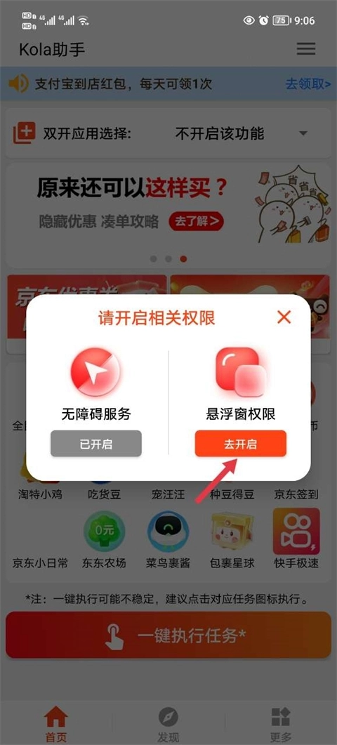 1、进入软件之后,随便找一个任务活动点击就会弹出需要开启无障碍和悬浮窗权限。