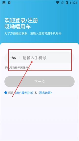 1、进入【哎哟喂用车】的登录或注册页面后,先在【请输入手机号】的输入框中填写你常用的手机号码,接着勾选同意相关协议,再点击“下一步”按钮来继续后续流程。