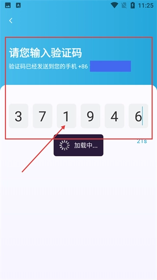 2、进入验证码页面后,将收到的验证码依次填入对应输入框,等待加载完成后即可进入后续步骤。