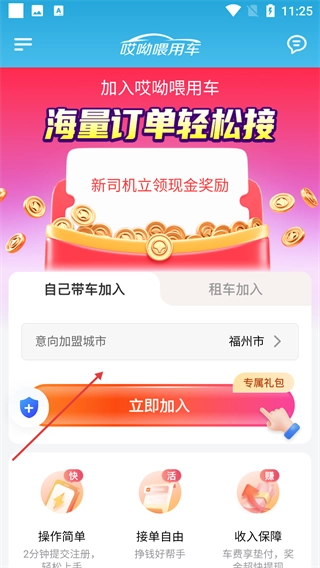 4、完成账号注册后,进入加入页面,选择【意向加盟城市】,点击【立即加入】即可申请成为平台司机,获取订单资源。