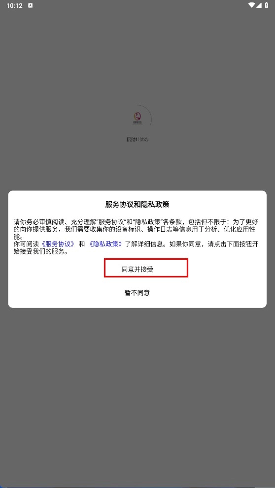 1、仔细阅读《服务协议》与《隐私政策》后,点击【同意并接受】按钮,即表示您已接受相关条款,可继续使用招财蛙优选服务。