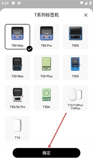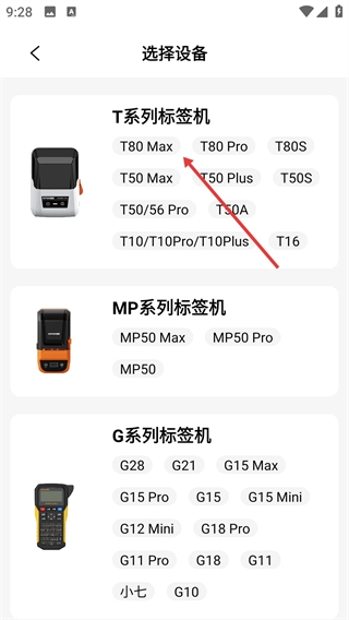 2、在选择设备页面点击【T80Max】选项,进入T系列标签机选择页面。