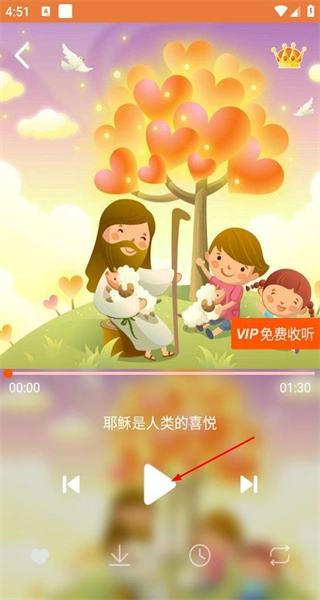 4、进入耶稣是人类的喜悦播放页面,点击播放按钮收听,界面有温馨画面,可通过控制按钮管理播放。