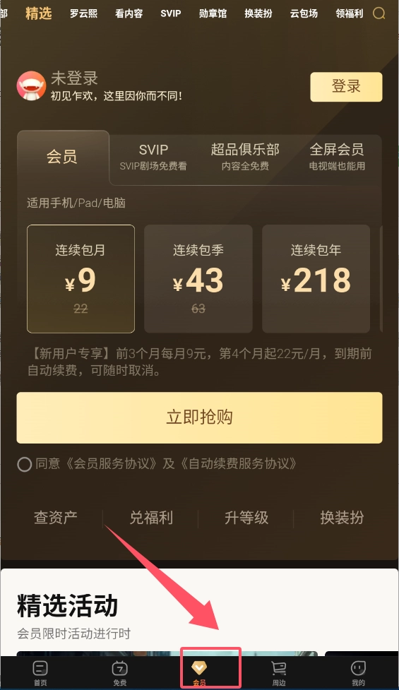 3、资产服务板块可以查看会员状态、优惠券等权益。互动社区功能允许用户参与内容讨论,分享观看心得。