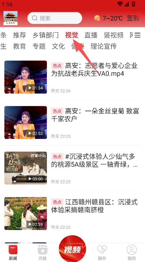 1、启动软件后,点击“视觉”板块,浏览包含高安志愿者庆生、金丝皇菊助力致富等内容的本地视频资讯。