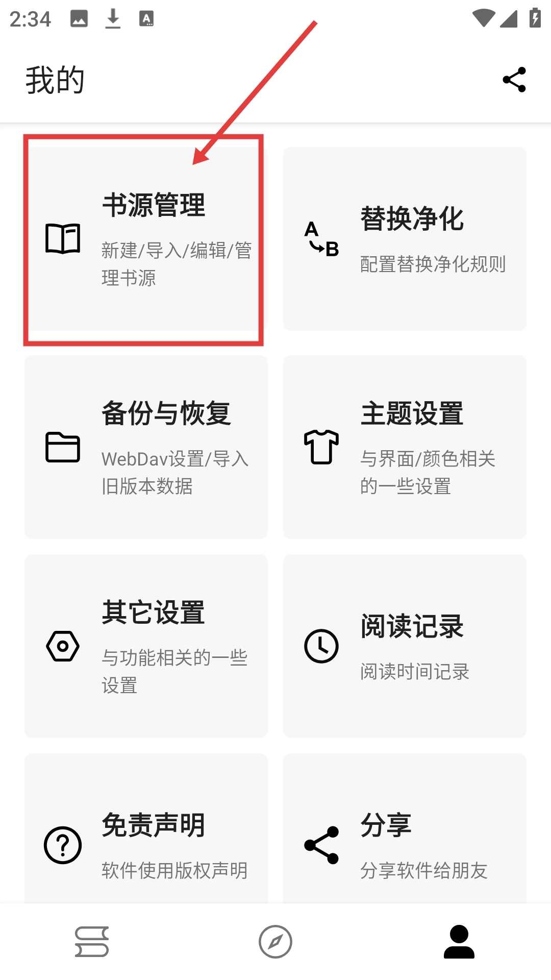 1、进入“我的”页面后,点击【书源管理】选项,就能进入书源管理页面,为后续的书源导入操作做好准备。
