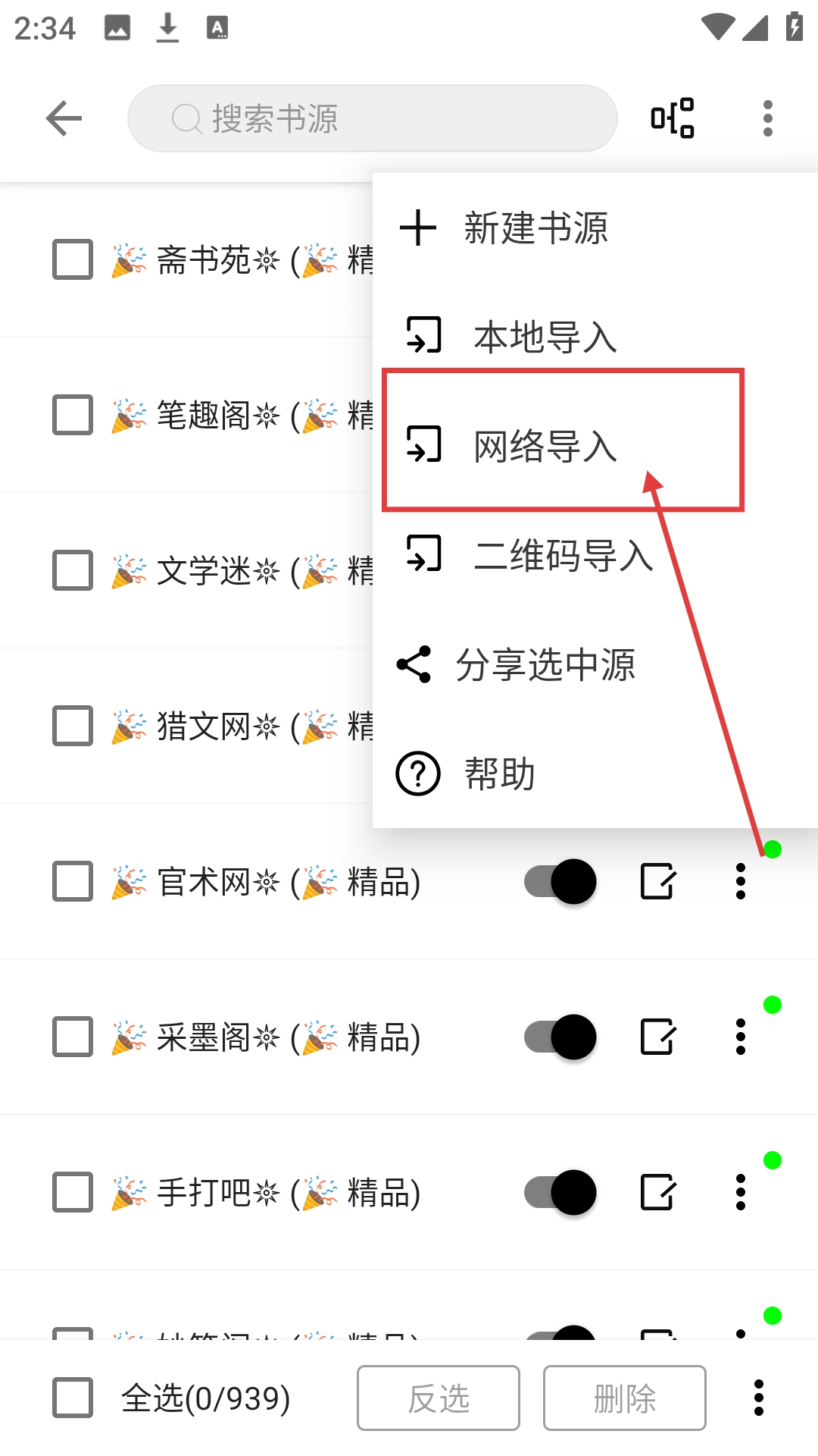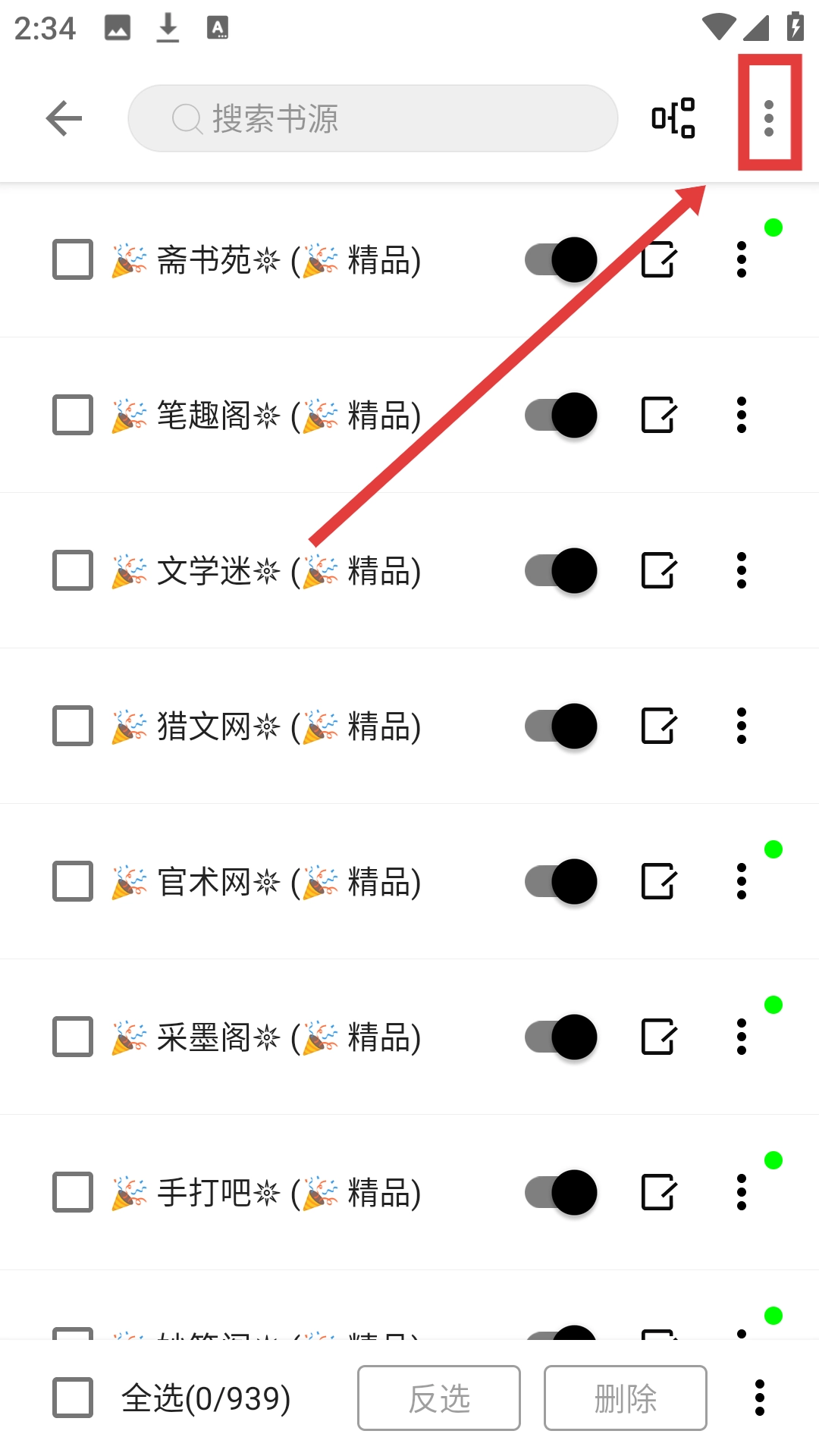 2、进入书源管理页面后,点击右上角三点按钮,可展开书源操作选项哦。