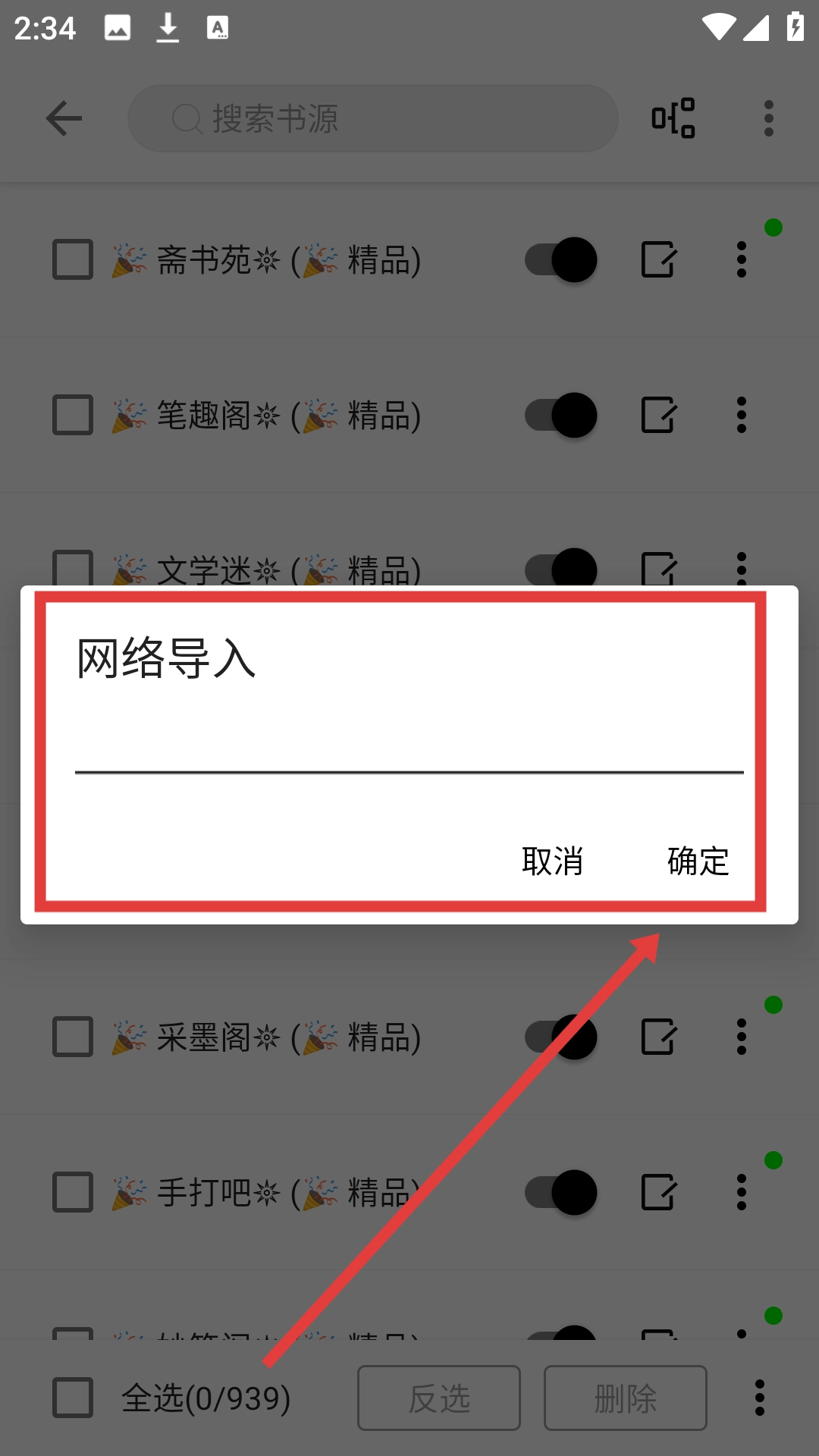 4、在网络导入页面,输入相关信息后点击【确定】,即可完成书源的网络导入哦。