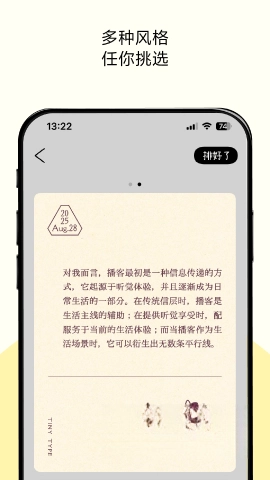 排版小动物这款应用能给您带来超棒的排版体验!在这里您可以自由编辑,体验到多种风格的精美排版。不管是记录心情还是灵感,这款软件都能轻松帮您保存珍贵内容。操作很简单,您只需输入文字,就能自动生成漂亮的排版,而且还有多样化的风格任您挑选,让您的日常笔记一下子变成吸睛的图文卡片。