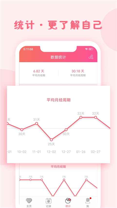 2、专业统计报表:自动计算平均周期长度与经期天数,生成阶段性健康报告,为就医咨询提供数据支持。