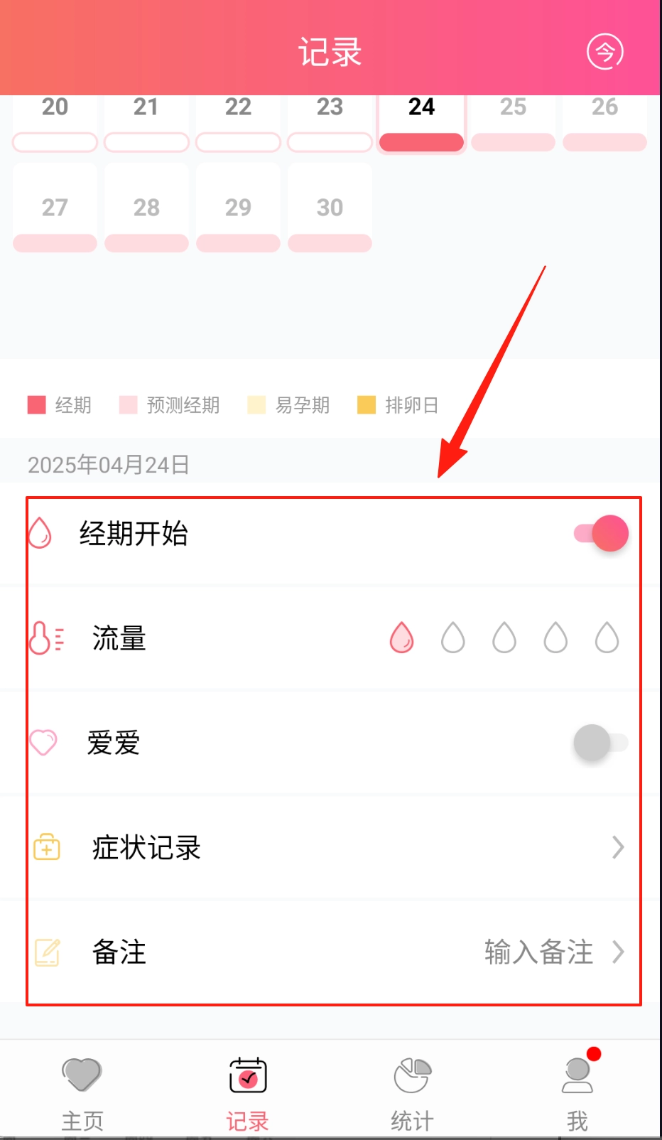 3、点击进入记录我们可根据流量、症状以及备注等操作,对当天的情况进行记录。