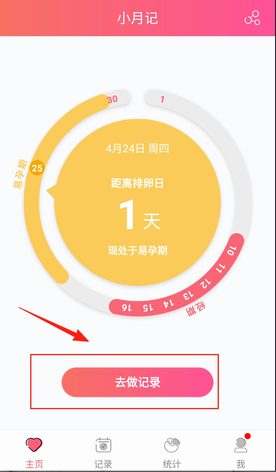 2、设置完成后,进入主页我们可清晰明了的查看到经期以及易孕期的分布情况。