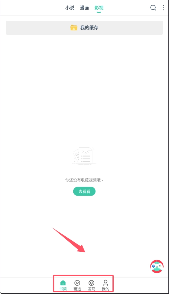 2、在精选页面可以看到小说、漫画、影视三个分类标签,点击能切换不同类型的内容推荐。如果暂时没有收藏任何书籍。