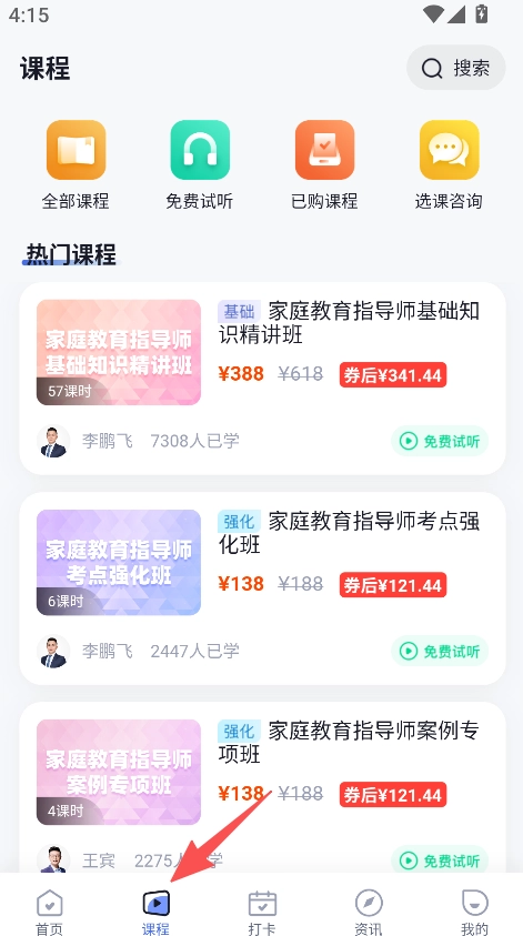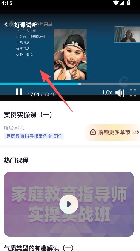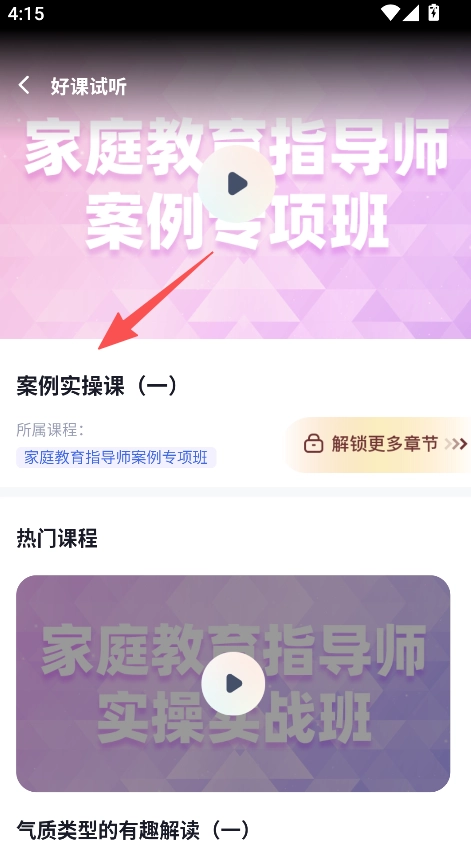 1、启动软件后,点击“课程”板块,从中选择家庭教育指导师相关课程,例如案例专项班。