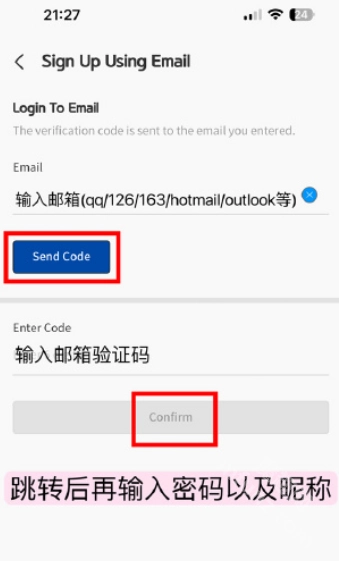 4、输入邮箱,获取验证码,然后输入密码和昵称。