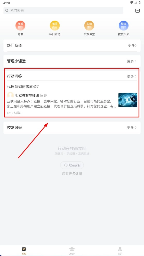 1、在应用首页找到【行动问答】板块,浏览热门问答内容,就能获取企业管理问题的专业解答与实用建议。