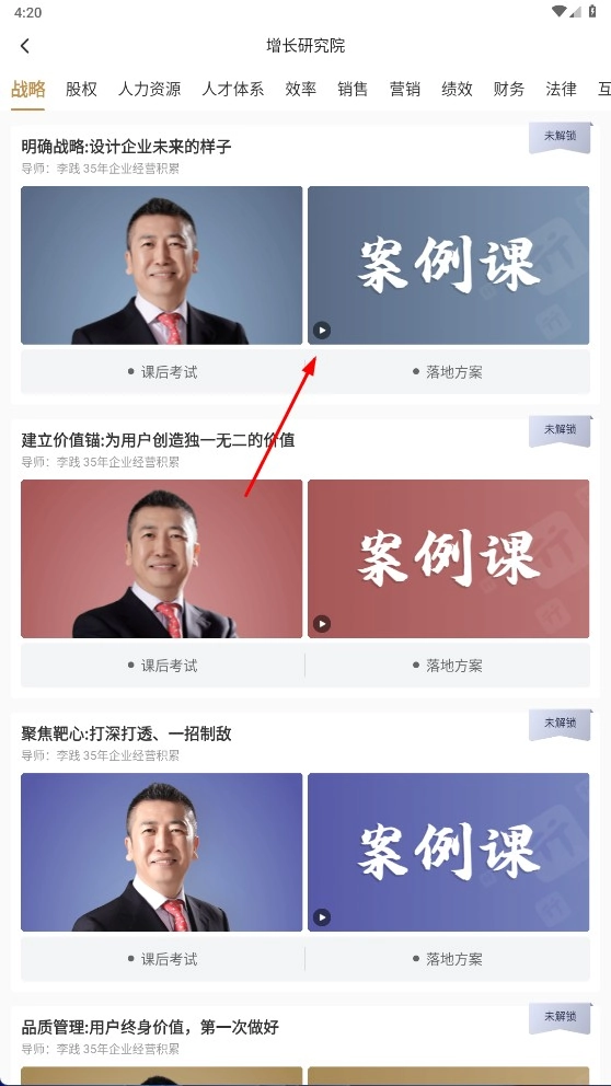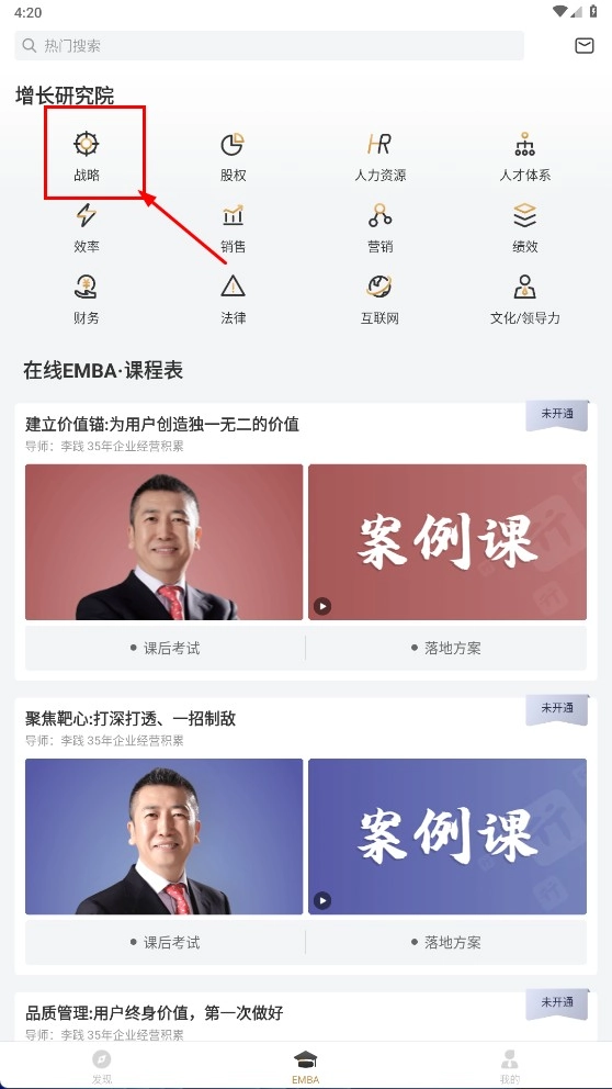 3、在增长研究院页面选择【战略】-【股权】模块,进入在线EMBA课程表,浏览并选择案例课学习。