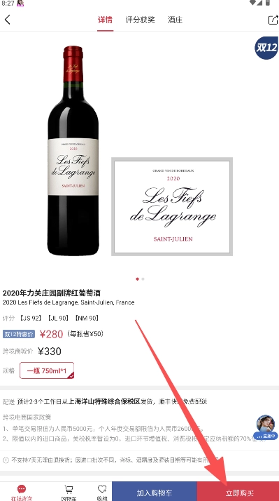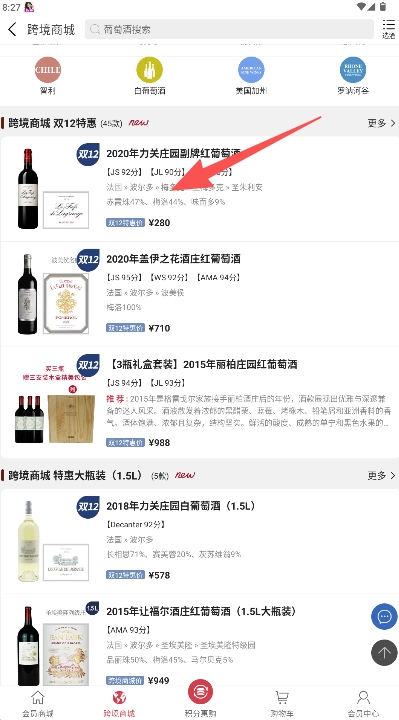 2、浏览并选择目标商品,例如“2020年力关庄园副牌红葡萄酒”。