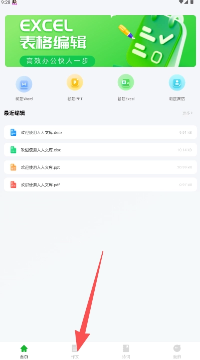 1、在首页底部的导航栏里找到“作文”按钮并点击它。
