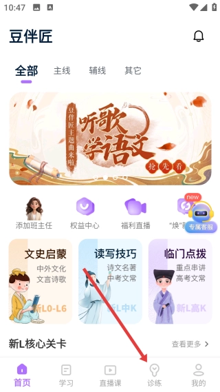 1、打开豆伴匠首页后,点击页面底部的【诊练】选项,即可进入豆伴匠诊练系统的功能页面。