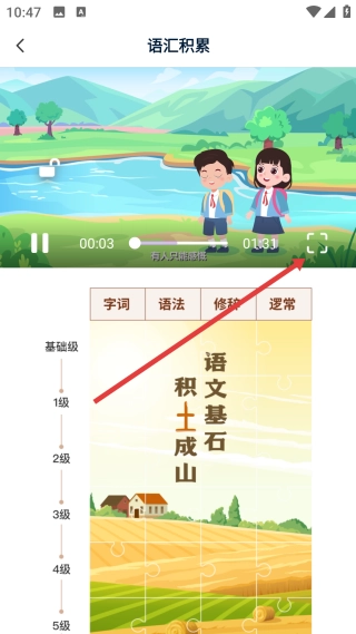 4、在播放页点击【最大化】,即可横屏观看视频,开始学习语汇积累的相关内容。