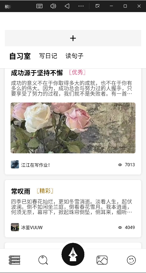 用户可以自由上传自己的文笔,一起“华山论剑”,有自习室、读书会、文学社、赶紧打卡打卡吧!