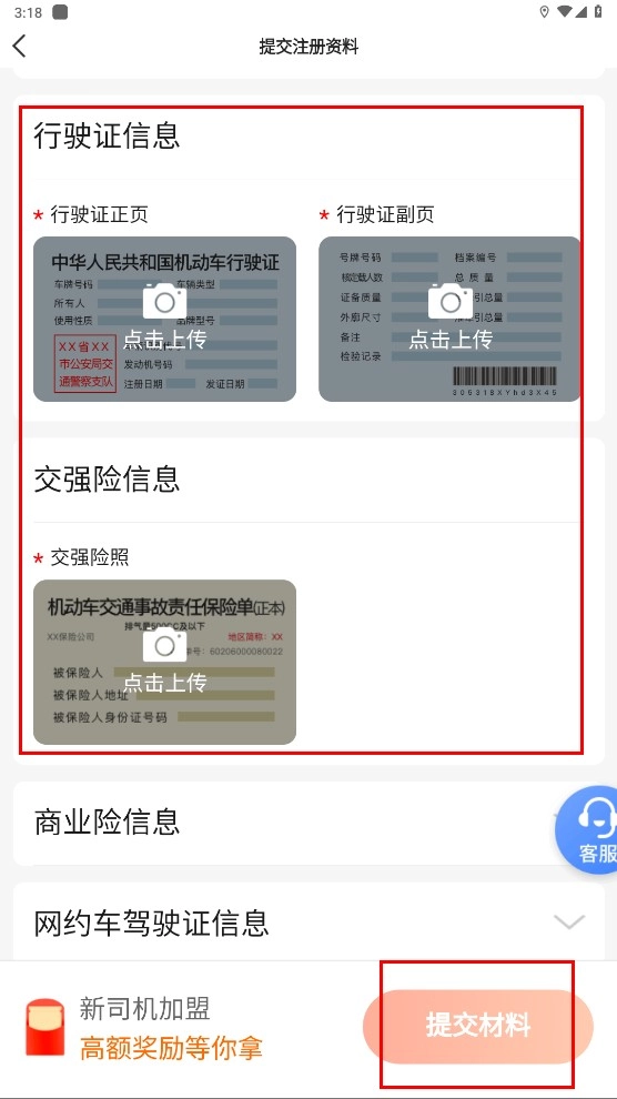 4、上传【行驶证正页】-【交强险照】等材料,确认无误后提交,完成雷利出行司机端的资料提交步骤。
